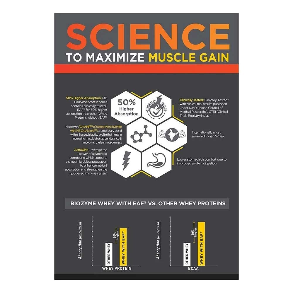 - 2. Scientific innovation of EAF® at its best: Forget whey protein that relies solely on generic ingredients. MB Biozyme Whey PR breaks the mold with a unique, science-backed Enhanced Absorption Formula (EAF®) which is a patented technology, that shatters all absorption barriers by ensuring 50% higher protein absorption – so, say goodbye to wasted potential (and those digestion issues) and hello to optimized muscle-building results
